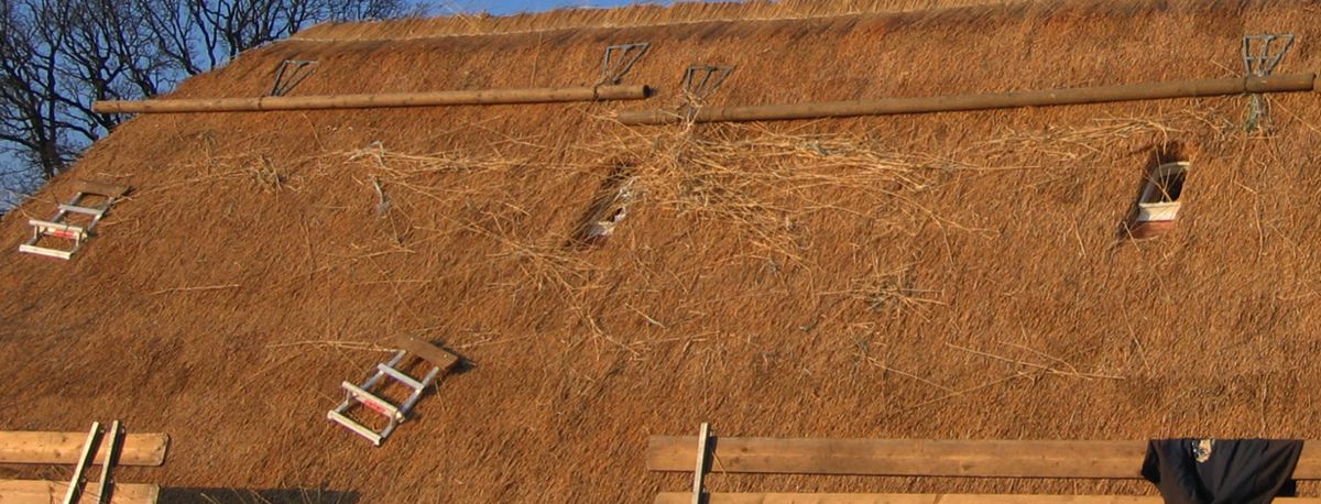 Op de kleine foto's op deze pagina een oud rieten dak dat door de jaren heen niet is onderhouden. Dan komt het er zo uit te zien. Zou je het dak zo laten, dan zal het dak zeer snel vergaan. De tweede foto toont het dak na onderhoud.